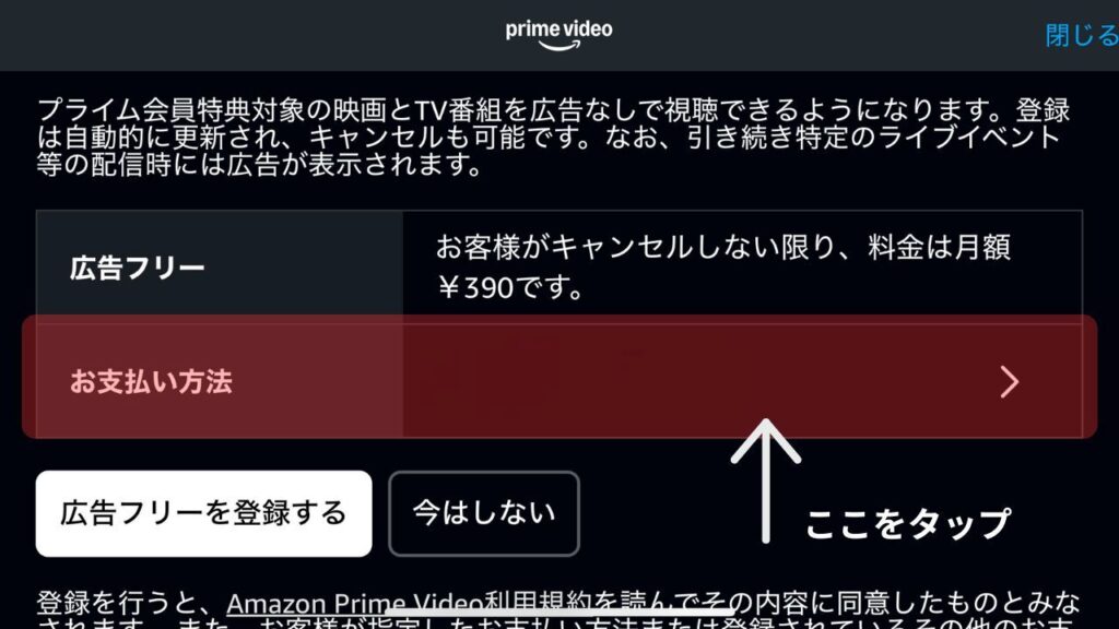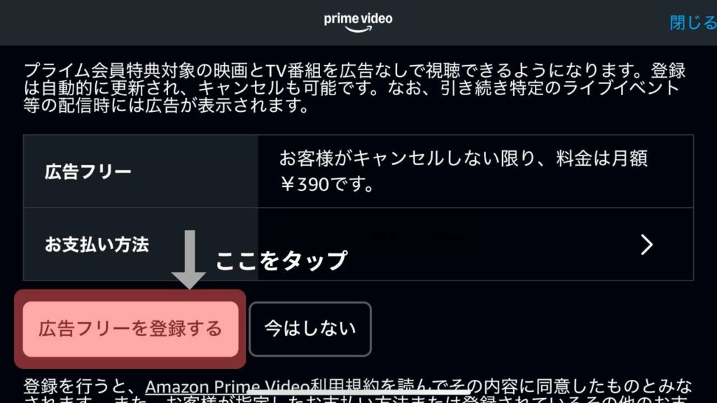 なぜなら、Prime Videoのアプリを開いてから5回タップするだけで、広告フリープランを設定できるからです。