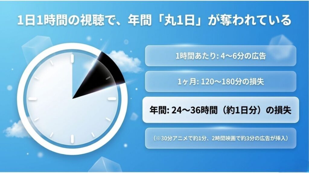 すると、1カ月で120~180分の損失で、年間だと広告の視聴だけで約1日が奪われてしまうのです。