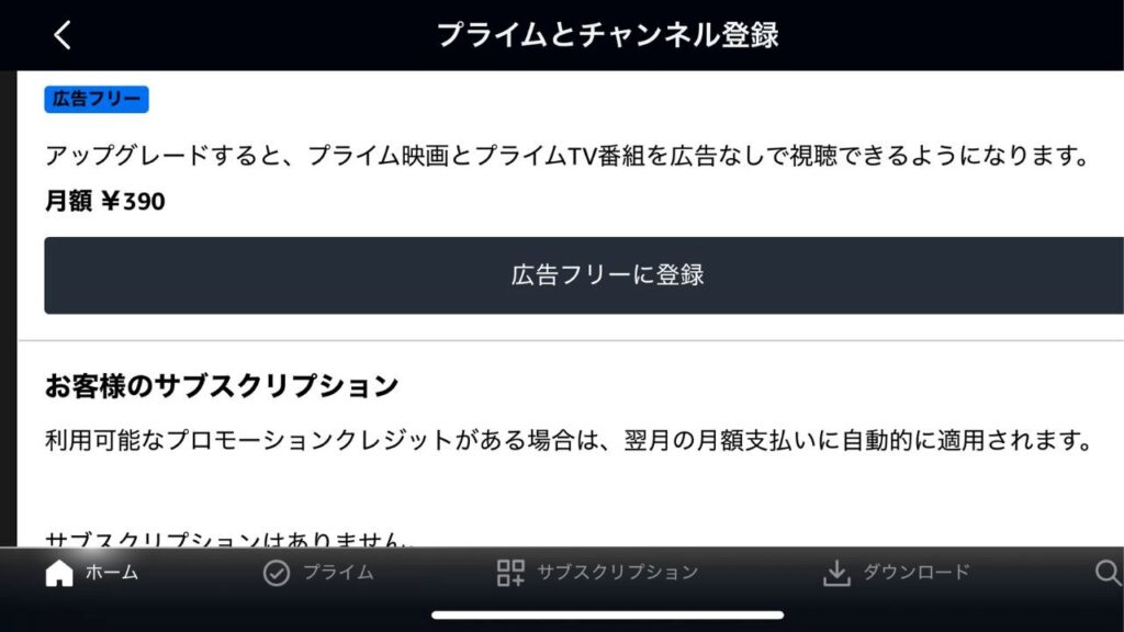 プライムとチャンネル登録以外では、広告が流れている最中に、後ほど記載する広告フリーに登録まで進むことができます。